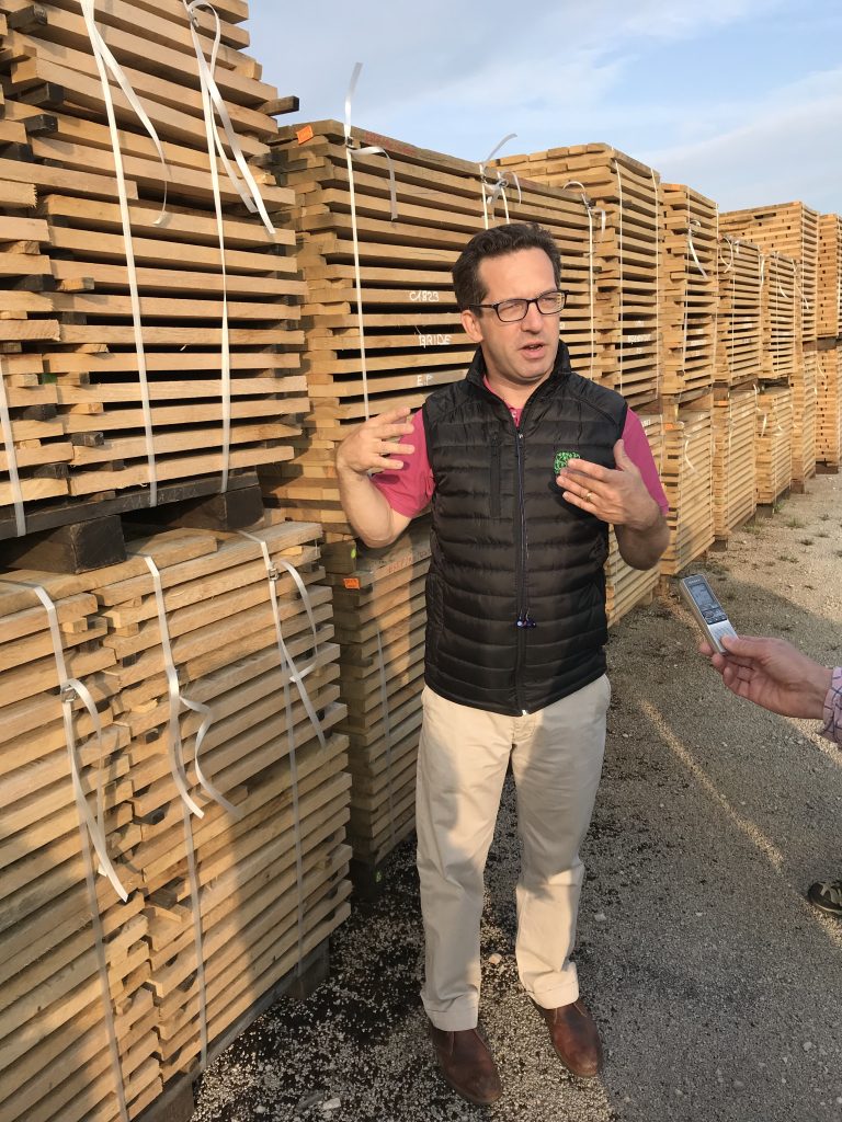Cadus hat seine Produktionsstätte in Ladoix-Serrigny, unweit des berühmten Hügels von Corton. Das Holz für die Eichenfässer stammt traditionell aus den regionalen Wäldern von Allier, Nièvre und den Vogesen. Die neuen Fässer heißen im Burgund „Pièces“ und fassen, anders als die „Barriques“ aus Bordeaux 228 statt 225 Liter. Vor dem Produktionsgebäude stapeln sich Unmengen von Eichendauben. Was ist das Besondere an diesen Holzlatten? Président Antoine de Thourie (im Bild) führte geduldig in die Feinheiten von Sorte, Dichte und Lagerungsmethoden ein.