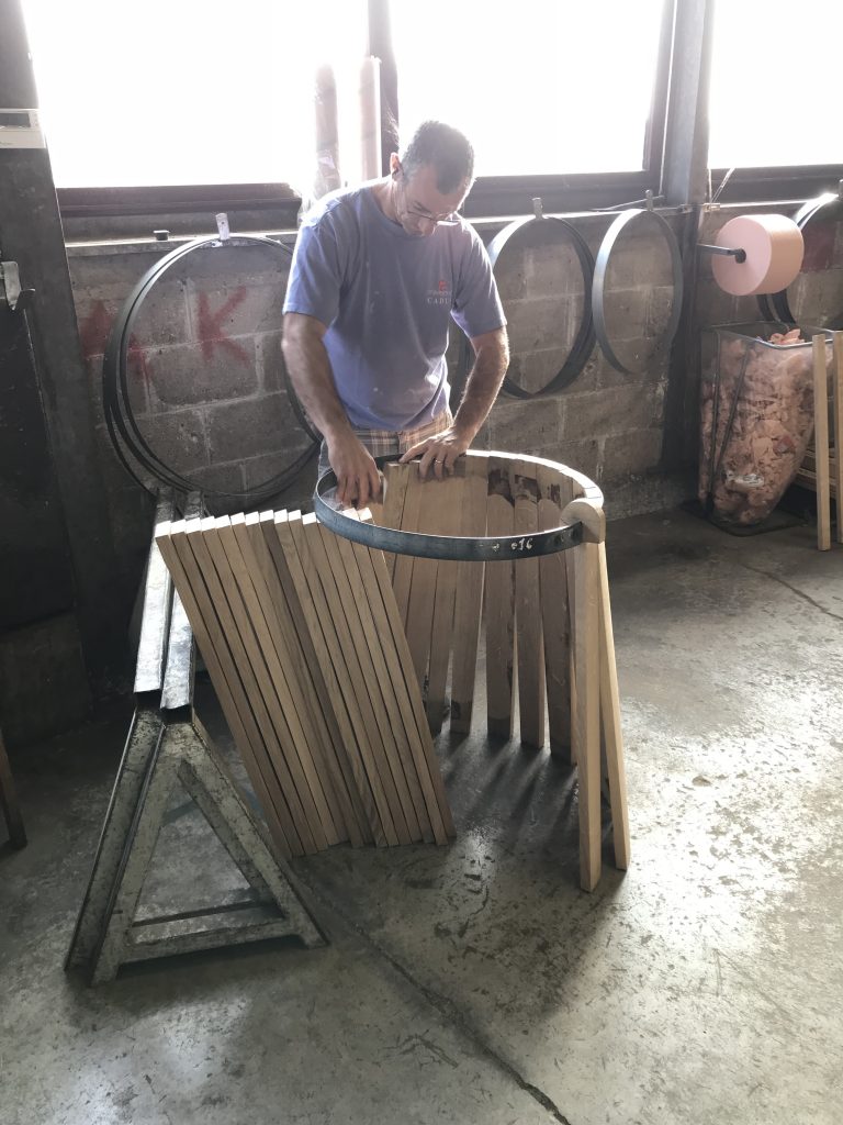 Die Fässer werden exakt nach Kundenwunsch gefertigt – Holzart, Maserdichte und Toastung werden auf den gewünschten Stil abgestimmt. In der Werkshalle werden die Dauben zunächst passgenau zugeschnitten. Die Fässer werden dann von Hand aus den einzelnen Dauben zusammengesetzt, was einiges an Geschick erfordert.